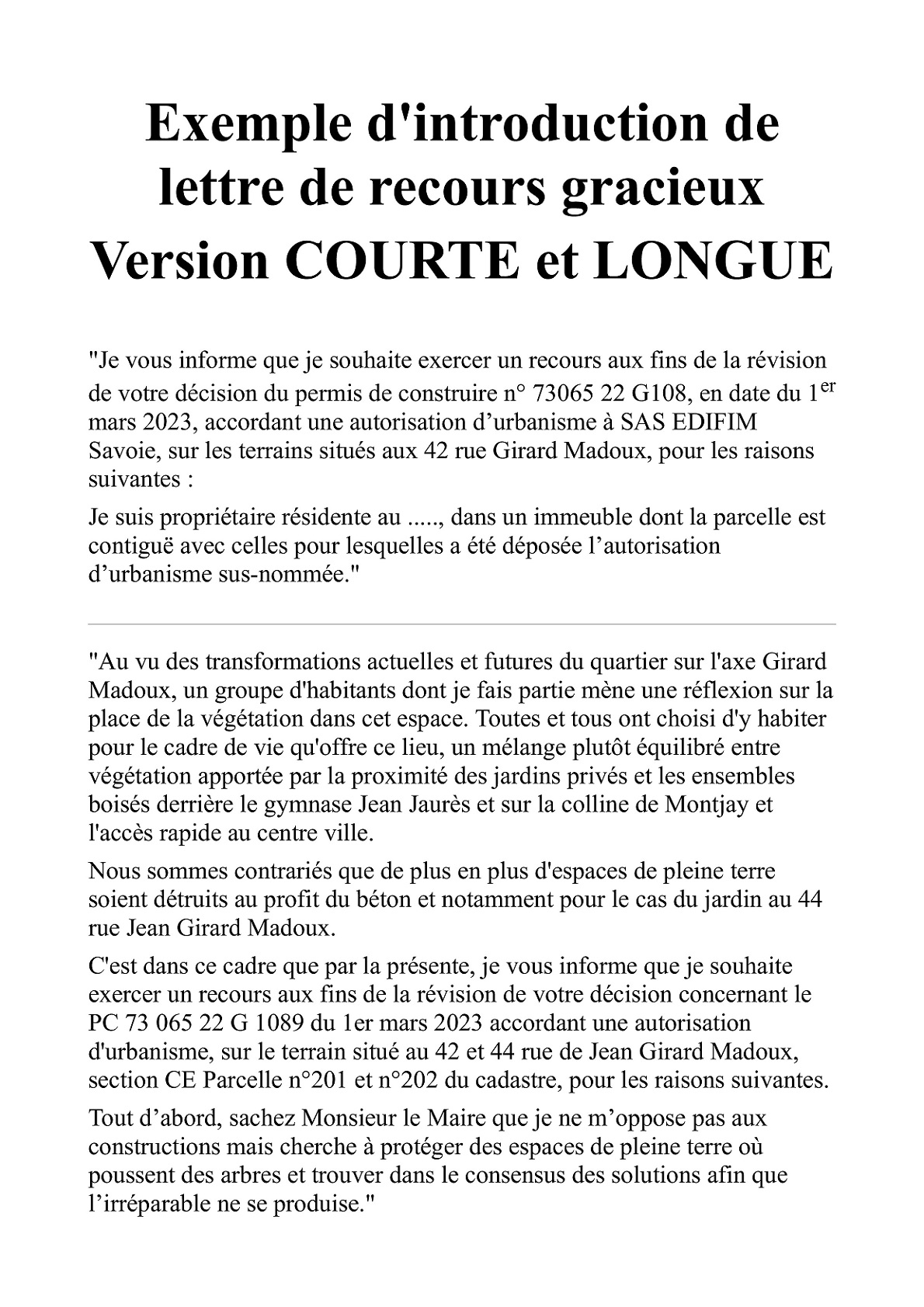 Cette lettre recommandé avec accusé de réception est à destination à la fois de la commune qui a délivré le permis de construire et au promoteur qui en a fait la demande pour que cette délivrance soit graciée, annulée. Les services de l’état ont édité une fiche très claire de comment contester une autorisation d’urbanisme, comme un permis de construire. https://www.service-public.fr/particuliers/vosdroits/F20567